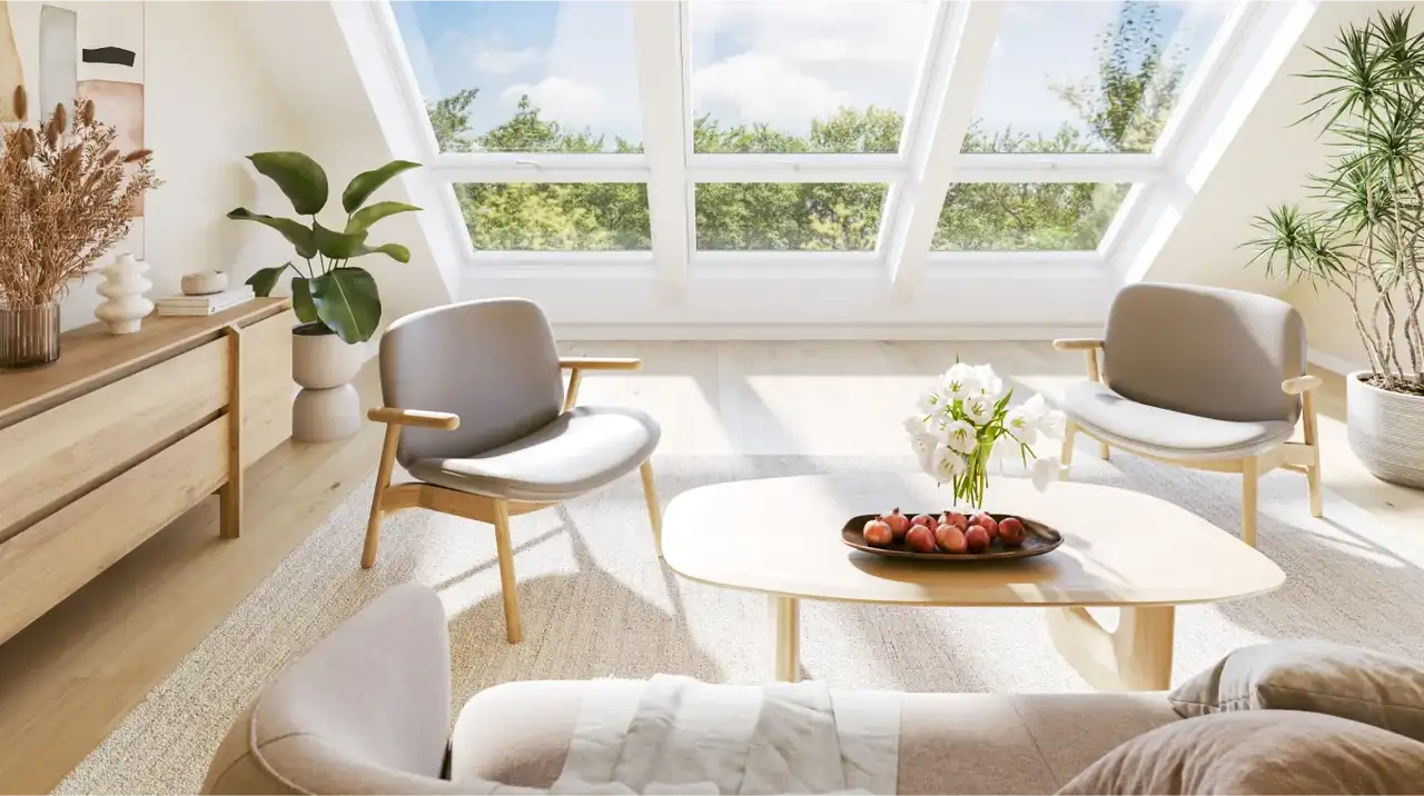 Povezava z naravo: Strešna okna prinašajo ne le svetlobo, ampak tudi razgled na drevesa, nebo in meglice. Ta povezava z zunanjostjo je ključna za skandinavsko filozofijo bivanja.